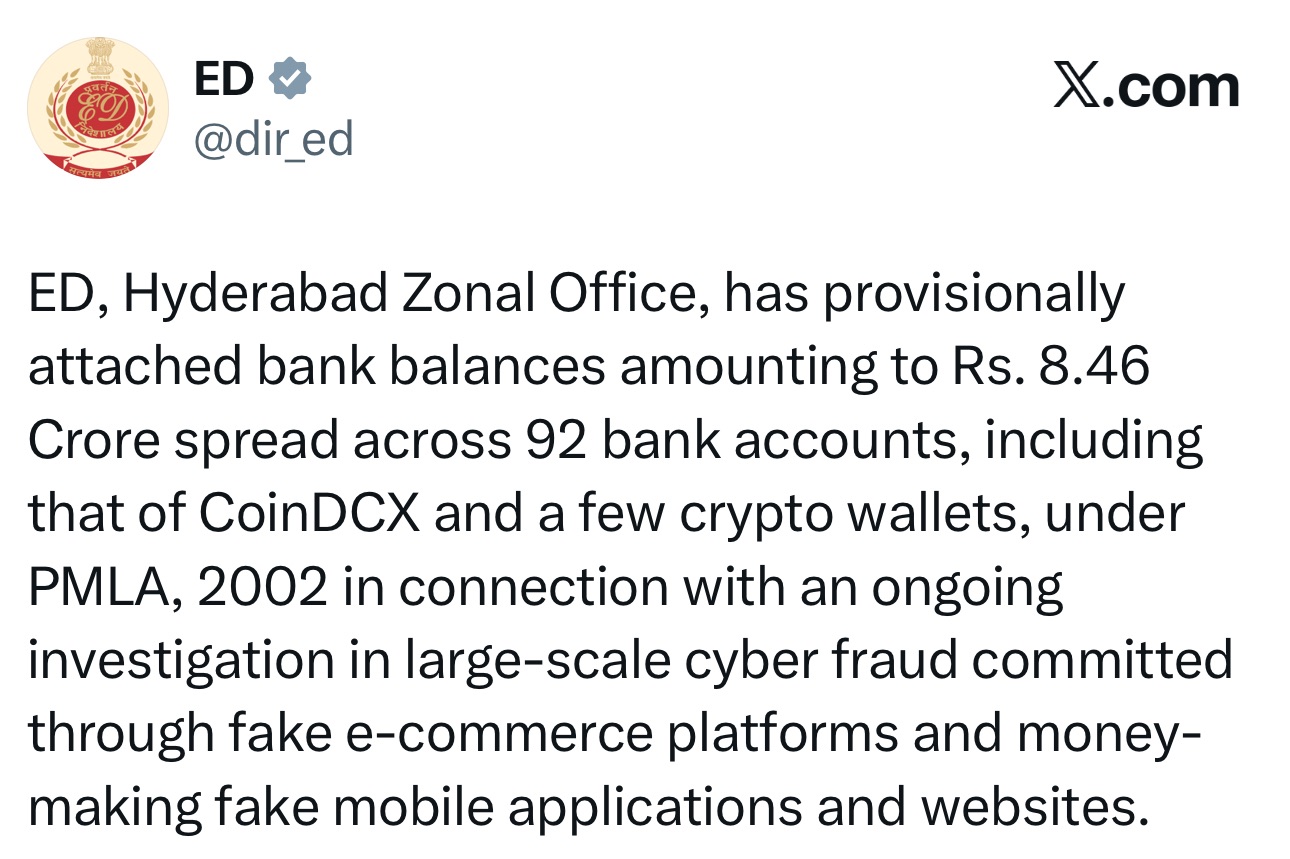 Directorate of Enforcement, Hyderabad Zonal Office, attached Rs 8.46 Crore held across 92 bank accounts. The action covers accounts linked to CoinDCX and several crypto wallets. The attachment was issued under PMLA in an ongoing probe into large-scale cyber fraud through fake e-commerce platforms and money-making applications. The probe started after Kadapa Police filed multiple…
